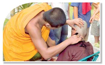 කුල දරුවෙකු පැවිදි දිවියට ඇතුළත් කිරීමේදී කෙස් රැවුළු කැපිය යුතු බව ධර්ම විනය පිටකයේ සඳහන් වේ. ඒ අනුව කපා ගන්නා ලද කෙස් කැබැල්ලක් ඔහු අත මත තබා පිරිමැද කේශා, කේශා, කේශා.... යනුවෙන් එහි ඇති පිළිකුල් බව මෙනෙහි කරමින් භාවනාවක් කළ යුතු බව දක්වා තිබේ. ඒ ආකාරයෙන් මෙනෙහි කිරීමේදි සමහර පිංවත් දරුවන් මහණ කිරීමටත් පෙර ධර්මය අවබෝධ කර ගනී. ඉන්පසුව භික්ෂූන් වහන්සේ හිස කෙස් ඡේදනය කරන සෑම අවස්ථාවකදී ම, ඒ ආකාරයෙන් මෙනෙහි කිරීමෙන් කර්මස්ථානයක් ද වේ. කෙසේ වෙතත් රේරුකානේ චන්දවිමල නායක ස්වාමින් වහන්සේ රචනා කර ඇති ‘‘උපසම්පදා ශීලය” නැමති කෘතියෙහි කෙස් රැවුළු පිළිබඳ සඳහන් කර ඇත. (එය සඳහන් වන්නේ චුල්ලවග්ගපාලියෙහිය). එම පොතෙහි සීක පදවල දැක්වෙන ආකාරය පහත දැක්වේ.‘‘න භික්ඛවේ දීඝා කේසා ධාරෙතබ්බා, යො ධාරෙය්ය ආපත්ති දුක්කටස්ස අනුජානාමි භික්ඛවේ දුමාසිකං වා දුවංගුලාම් වා ‘‘මහණෙනි දික් හිසකේ නොදැරිය යුතුය. යමෙක් දරා නම් ඔහුට දුකුළා ඇවැත් වේ. මහණෙනි දෙමසකට වරක් හෝ දෙඅඟලක් (අඟල් දෙකක්) වැඩුණු කල්හි හෝ හිසකෙස් කැපීම අනුදැනිමි.” (දුකුලා ඇවැත් බරපතළ ආපත්ති නොවේ. පෝය කර්ම, විනය කර්ම දේශනාවෙන් එම ඇවැත් පහ (නැති) කර ගැනිමට හැකියාව පවතී).