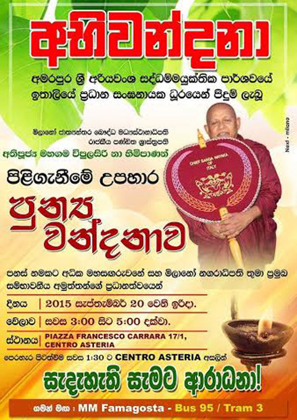 අමරපුර ශ්රි ආරියවංශ සද්ධම්මයුක්තික පාර්ශවයේ ඉතාලියේ ප්රධාන සංඝනායක ලෙස පත් කෙරුණු මිලානෝ ජාත්යන්තර බෞද්ධ මධ්යාස්ථානාධිපති මහගම විපුලසිරි හිමියන් පිළිගැනීම මිලානෝ නගරාධිපතිගේ ප්රධානත්වයෙන් මිලානෝ නුවර ෆ්රැන්චෙස්කෝ කරාරා චතුරස්රයේ අංක 17 / 1 ඇස්ටේරියා මධ්යස්ථානයේ දී ලබන ඉරිදා සවස 3 ට පැවැත්වීමට යයි.