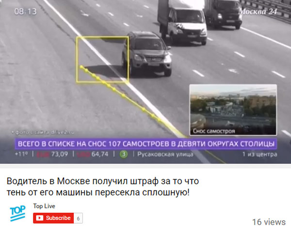 මොස්කව් නගරයේ තමා රිය පදවමින් සිටියදී එසේ දඩ නියමව ඇතැයි ඔහු කියයි. ඔහු නිවැරදි මංතීරුවේ රිය ධාවනය කරන ආකාරය ඡායාරූපයේ දිස්වන අතර එම වාහනයේ සෙවනැල්ල සුදු ඉර කපන අයුරු එහි සටහන්වී ඇත.