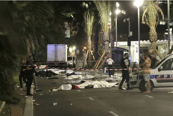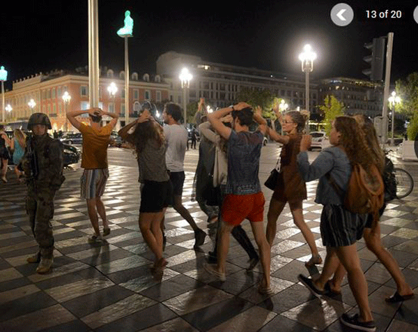 රාත්රී 10ට ආරම්භ වූ මල් වෙඩි 10.40 වන විට අවසන් වෙමින් තිබුණේය. රාත්රී 10.45 ට අධිශීතකරණ සහිත ටොන් 19ක් බරැති ලොරියක් එක් වරම ඉහත මාවතේ රැස්ව සිටි පිරිස යට කරමින් ඉතා අධික වේගයෙන් ධාවනය වීමට පටන් ගත්තේය. ලොරිය වට කොට ලූහුබඳින ආරක්ෂක භටයෝ එය නැවැත්වීමට උත්සහා ගත් අතර ලොරියේ රියදුරා ඔහු වටා සිටි පොලිස් භටයන් තිදෙනෙකුට වෙඩි තබමින් ඉදිරියට ගමන් කළද ආරක්ෂක භටයන් ගෙන් එල්ලවූ වෙඩි වරුසාවෙන් අඩපණ වූ ලොරිය මහ පාර මැද නැවතුන අතර 22.50 ට එහි රියදුරාද වෙඩි පහරින් මරුමුවට පත් වුයේය. ඔහු නිසල කිරීමට වෙඩි උණ්ඩ 27ක් පාවිච්චි කොට තිබුනේය. ඒ වනවිට කිලෝ මීටර් 2ක් පමණ ලොරිය ගමන් කර තිබූ අතර මහ පාර පුරාවට විසිරුනු මල කඳන්, කෑ කෝ ගසමින් හිස්ලූලූ අත දිව යන මහජන ගංඟාවෙන් සුන්දර පරිසරයක්ව තිබු නීස් නගරය අසුන්දර වීමට වැඩි වේලාවක් ගත නොවීය.