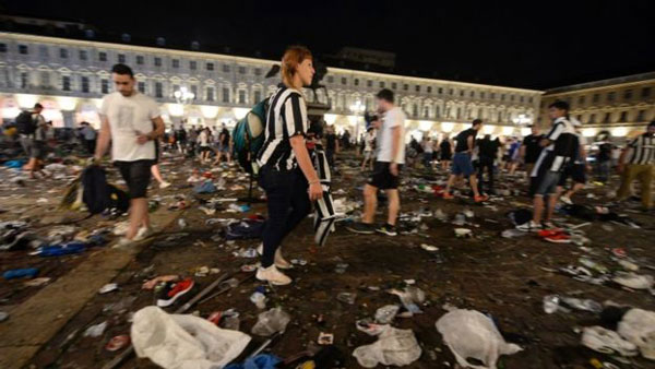 ශූරයන්ගේ ලීගය තරගාවලියේ අවසාන තරගය නැරැඹීම සඳහා එක් වූ ජුවෙන්ටස් පාපන්දු කණ්ඩායමට සහාය දක්වන්නන් පිරිසක් අතරේ මෙලෙස තෙරපීම ඇති වී තිබෙන අතර තිදෙනකුගේ තත්ත්වය බරපතළ යැයි ද වාර්තා විය.