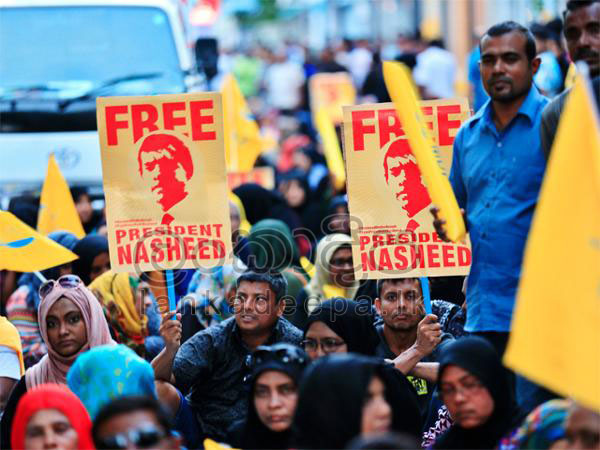 නෂීඞ් නිදහස් කරන්න යැයි සඳහන්වූ ටී ෂර්ටයන් පැළද සිටි හිටපු ජනපතිගේ ආධාරකරුවෝ සියයක් පමණ මෙම විරෝධතාවට එක්ව සිටියහ.ඔවුන් සියලූදෙනා කිමිදුම් උපකරණ පැළද දියෙහි ගිලී විරෝධතාවයේ නියැලූනහ.