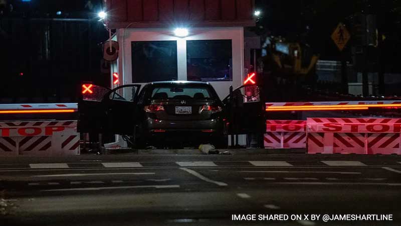 ජනාධිපති ආරක්ෂක අංශය පවසන්නේ මෝටර් රථය 17 වැනි වීදිය දෙසින් ඇති ගේට්ටුව හරහා මෙසේ ධවල මන්දිරයට කඩා වැදීමට තැත් කළ බවය.